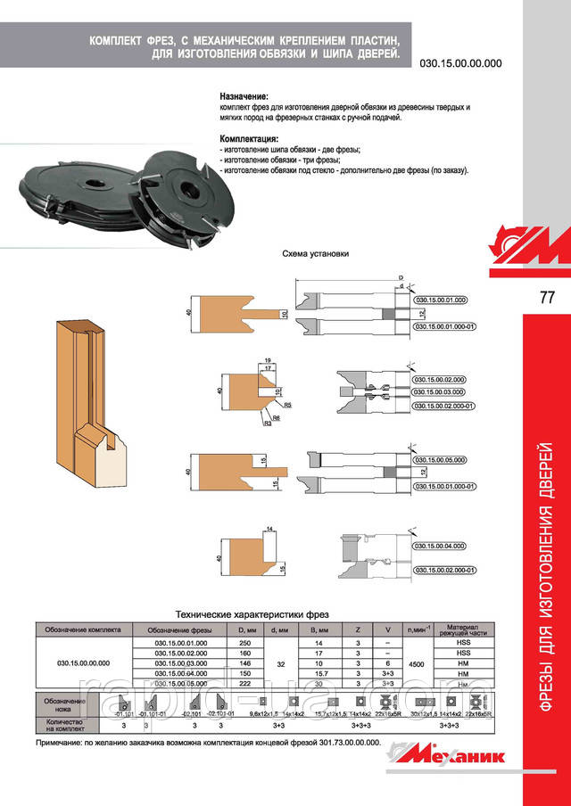 Фрези для виготовлення дверей ― обв'язки, шипа, під скло з механічним кріпленням твердосплавних ножів.